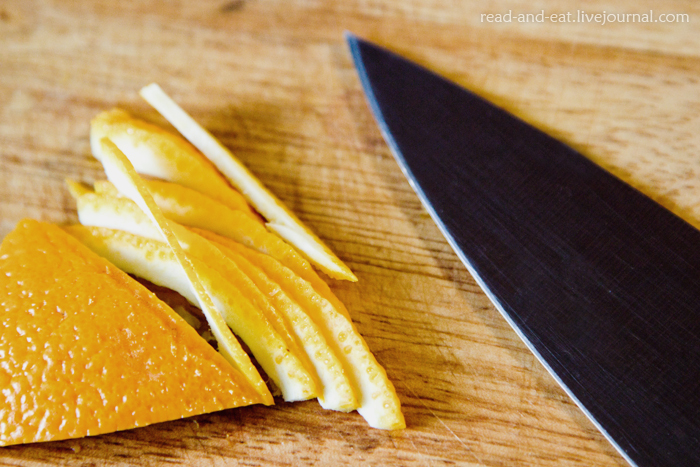 1. Спочатку готуємо цитруси. Апельсини і лимони розрізаємо навпіл і дуже ретельно видавлюємо сік. З половинок апельсинів вискребают залишилися в них білі плівки, але не викидаємо, а зберігаємо. Ділимо кожну половинку на 4 частини. Якщо кірки товсті, зрізаємо верхній шар білої частини (не всю). Нарізаємо максимально тонкою соломкою. Точно так само чинимо з цедрою грейпфрута (сік не потрібен, грейпфрут можна просто з'їсти).